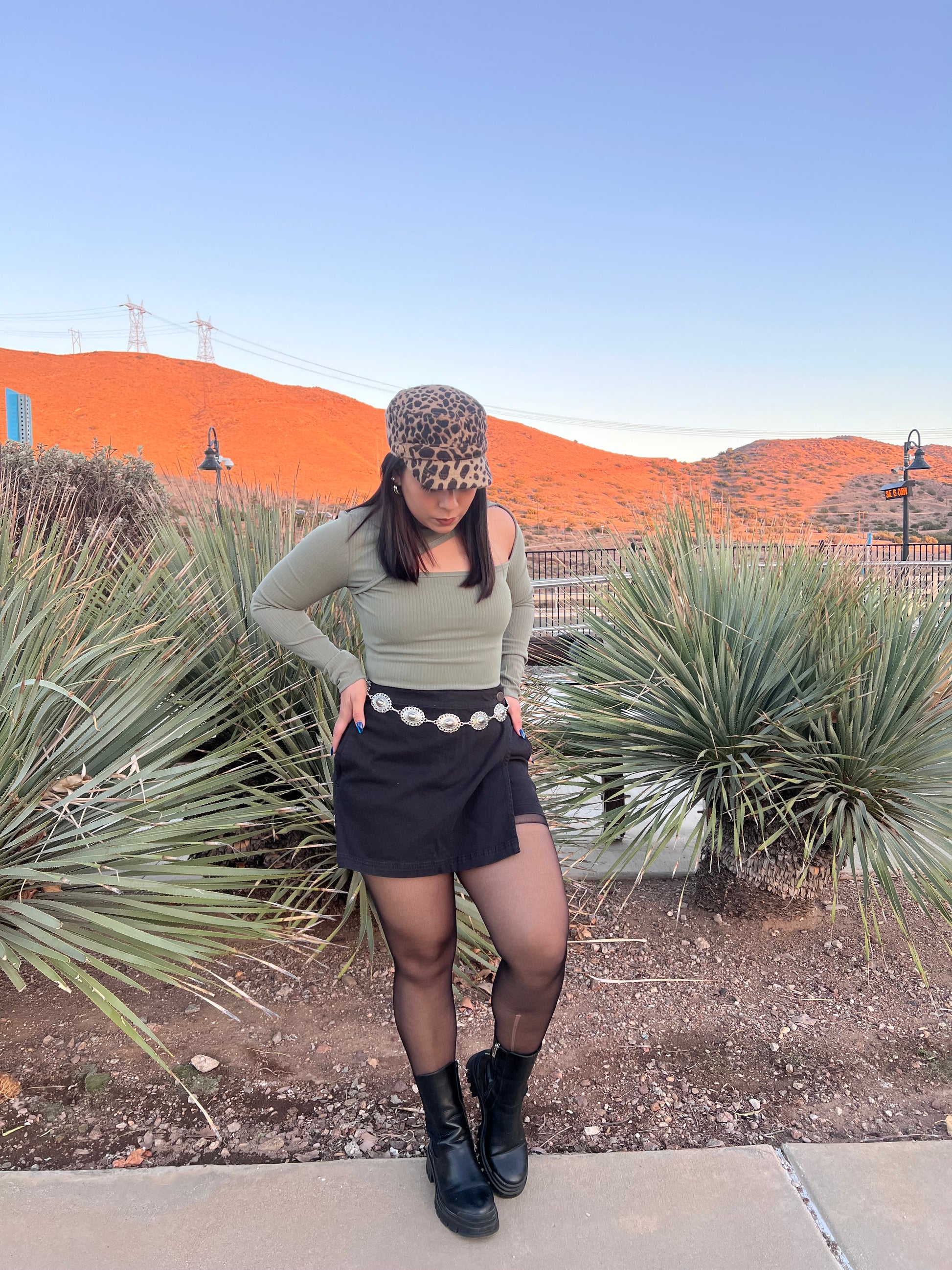 Dry leaf color : asymmetrical cut out gives an illusion of a perfect neck line. Long sleeve, fitted, waist length.